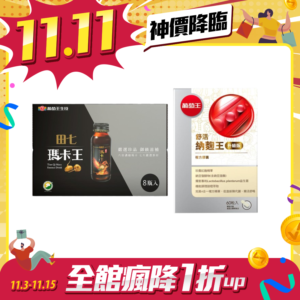 葡萄王 田七瑪卡王精華飲x8瓶 + 葡萄王 舒活納麴王升級版x1瓶