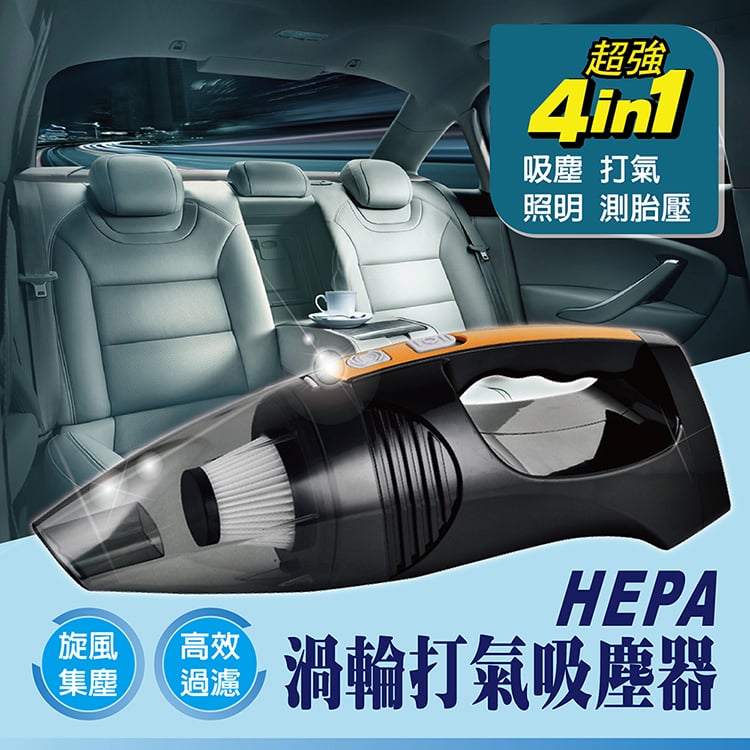 強力渦輪HEPA四合一吸塵打氣機(吸塵+打氣+測胎壓+LED照明)